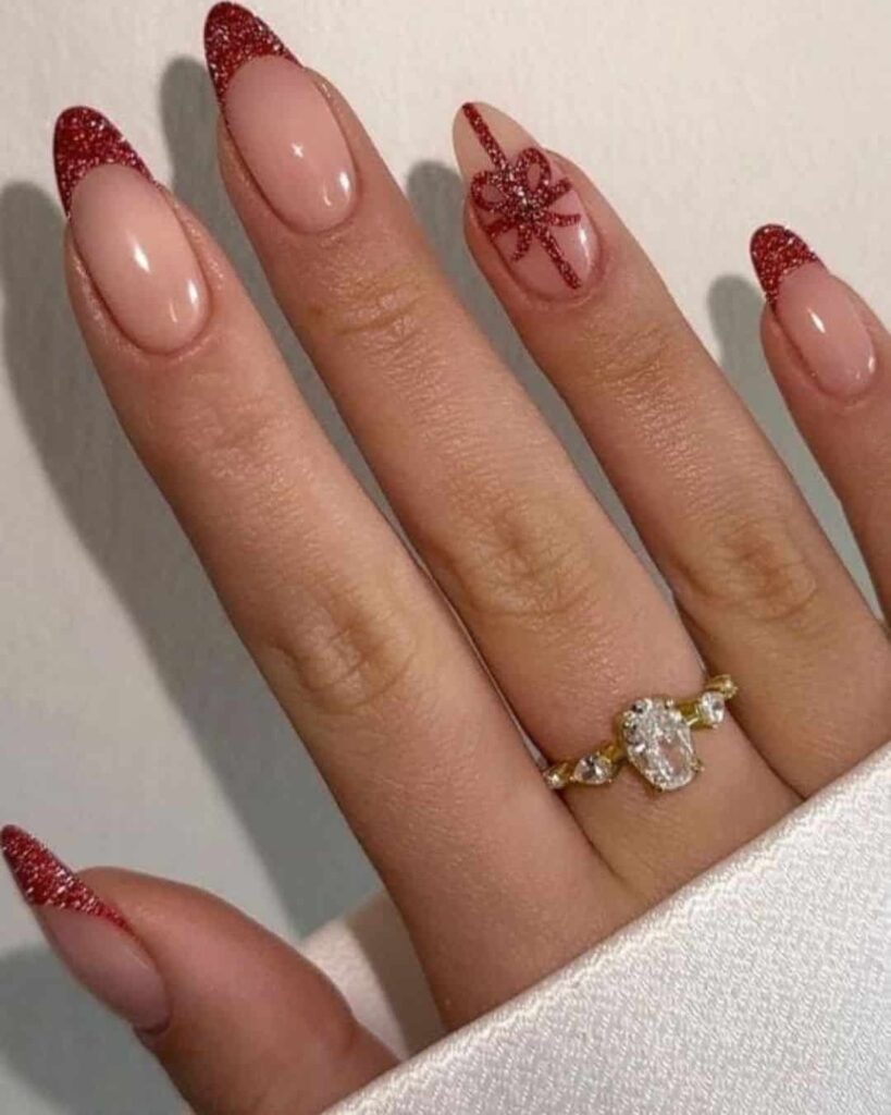 Although the look is simple, these sparkling holiday tips nails still feel festive and polished. The red glitter French tips create a clean, classy finish, while the tiny bow adds a soft holiday touch. The style fits well with Christmas nail designs of all kinds, whether you like French tips or more decorative holiday looks.