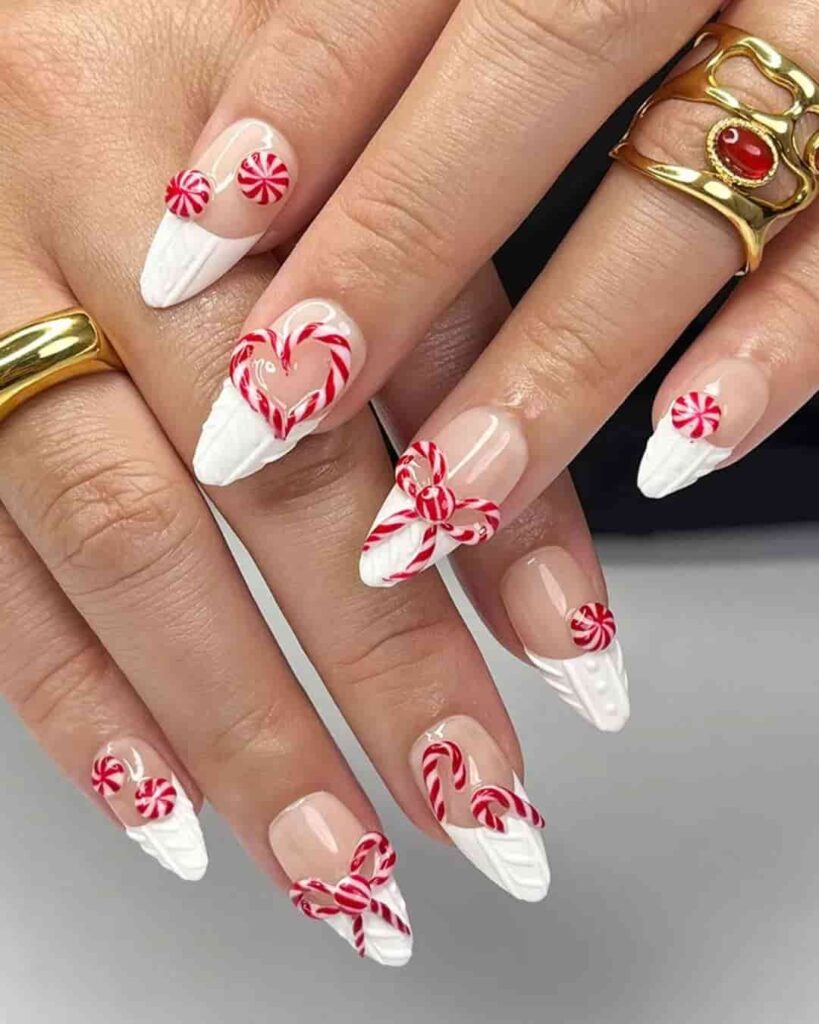 Playful and sweet, these candy cane christmas nails mix red and white stripes with a cozy textured sweater detail for a fun winter look. The design feels simple yet festive, which makes it perfect if you want cute christmas nails that stand out without being too bold.
