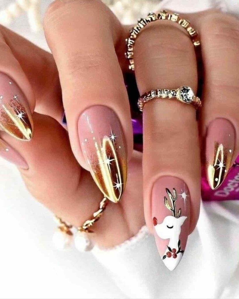 Elegant and festive, these golden reindeer glow nails mix a soft nude base with shiny gold accents for a classy holiday style. The tiny reindeer adds a fun touch without taking away from the luxury feel, which makes this design perfect for winter events or Christmas parties.