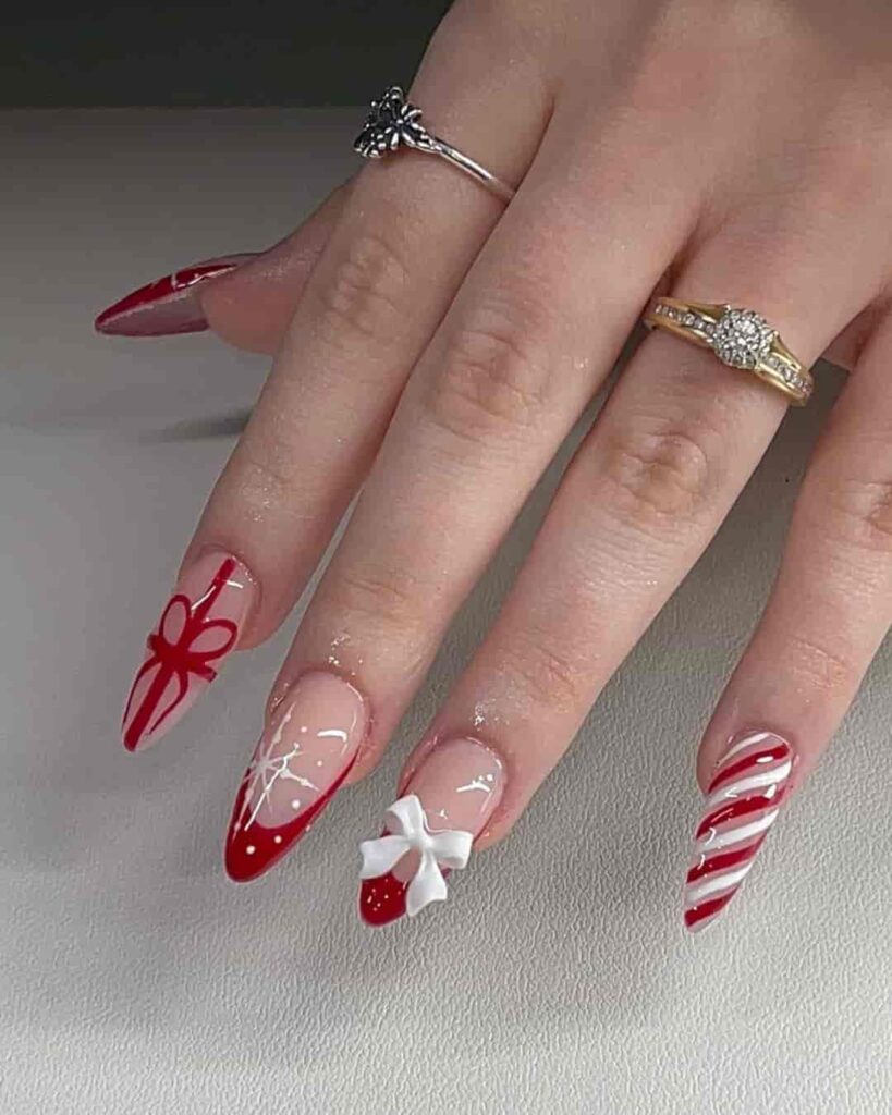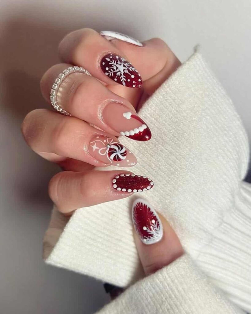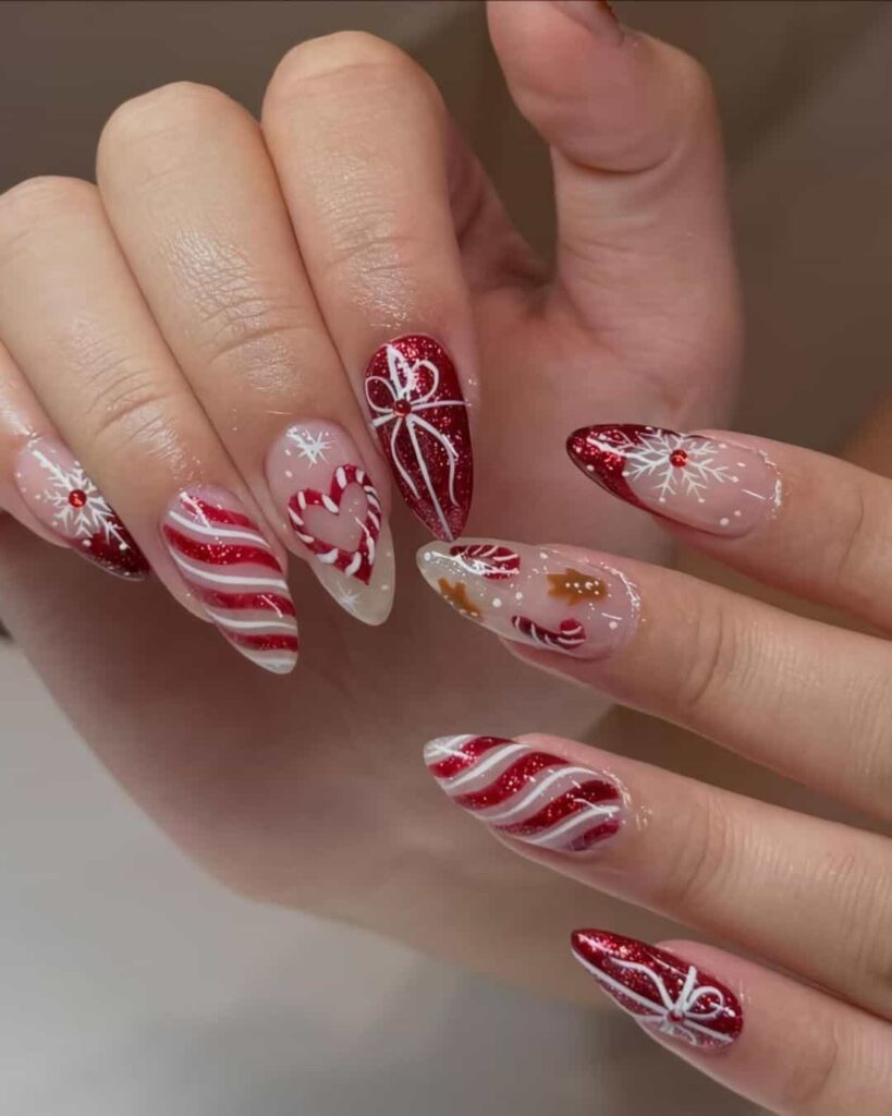 Festive and fun, these candy cane christmas nails mix glitter red polish with white stripes, hearts, bows, snowflakes and tiny gingerbread details for a cute holiday style. The blend of patterns and color makes the design playful and stylish, which is perfect if you’re looking for cute christmas nails with lots of personality.