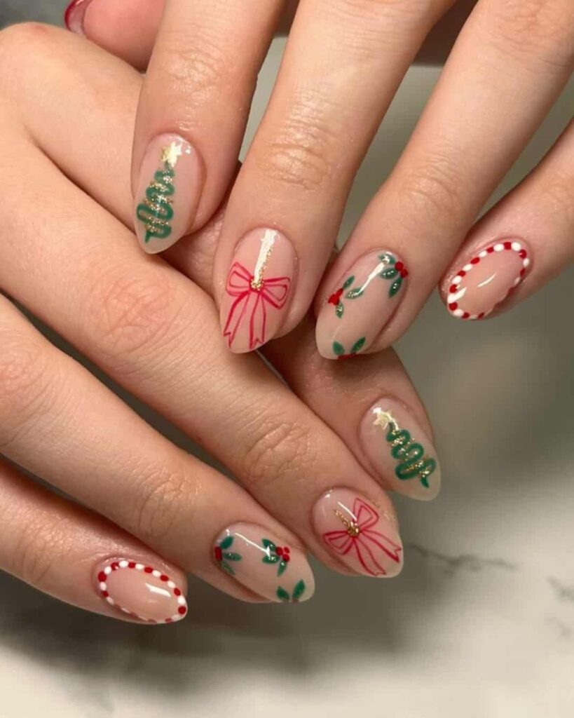 Sweet and playful, these festive bow and holly charm nails bring together tiny holly leaves, cute bows and dotted borders for a fun holiday look. The natural base keeps everything clean and balanced, so even with bright details, the design still feels neat and elegant. This idea is perfect if you want cute christmas nails that look festive without being too bold.