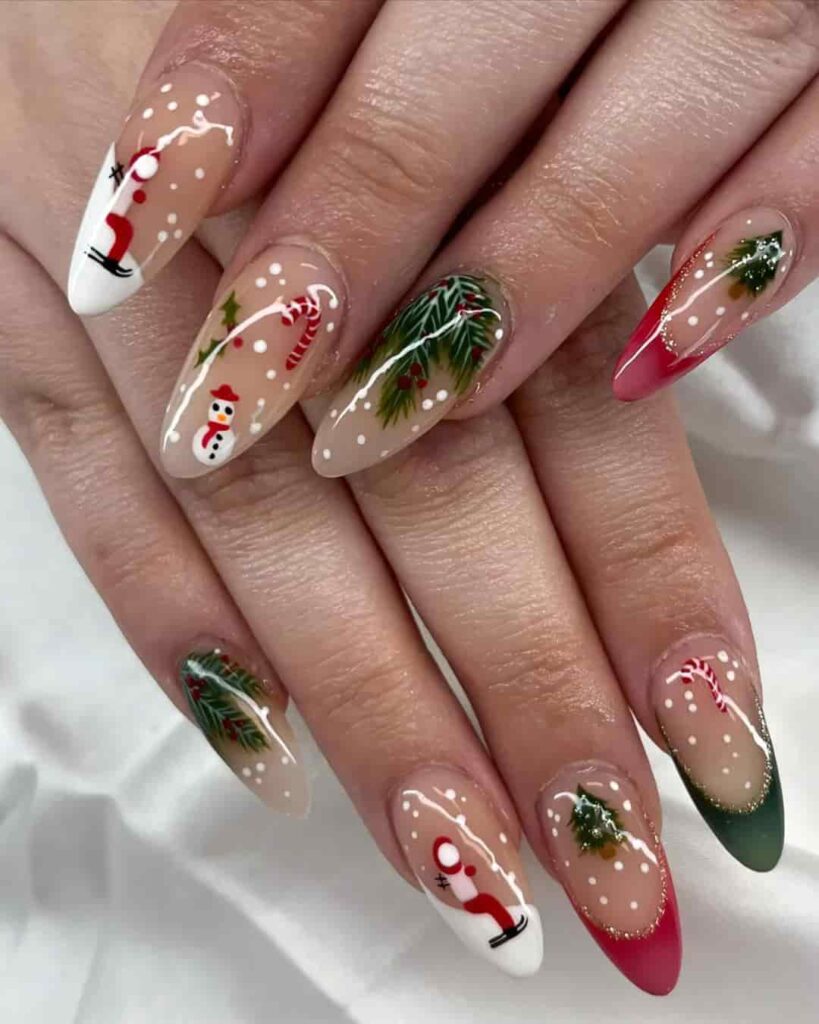 Playful and cute, these frosty christmas charm nails mix tiny snowflakes, mini trees, candy canes and little snowmen for a fun holiday style. The blend of red, green and soft nude tones keeps everything balanced and stylish, which makes this perfect if you love simple christmas nails with a detailed look.