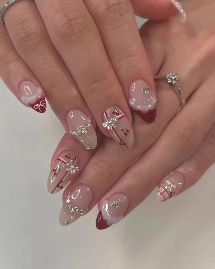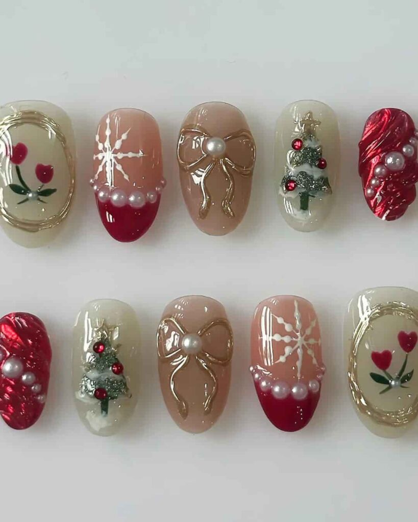 Soft and elegant, these pearl christmas glaze nails mix pearls, tiny bows, snowflakes and little Christmas trees for a festive but classy look. The nude base with touches of red and gold keeps everything balanced and stylish, which makes this design perfect if you love cute christmas nails that still feel refined and neat.
