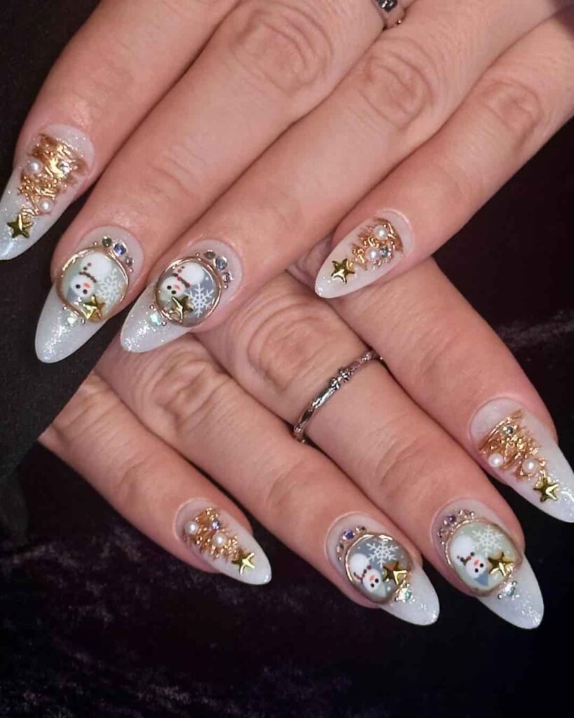 Dreamy and magical, these snow globe sparkle christmas nails mix a soft white base with glitter for a frosty holiday look. The tiny snowman adds a cute festive touch, and the gold stars and gems make the design feel elegant, which makes it perfect for winter outfits or Christmas parties if you love a soft but cheerful style.