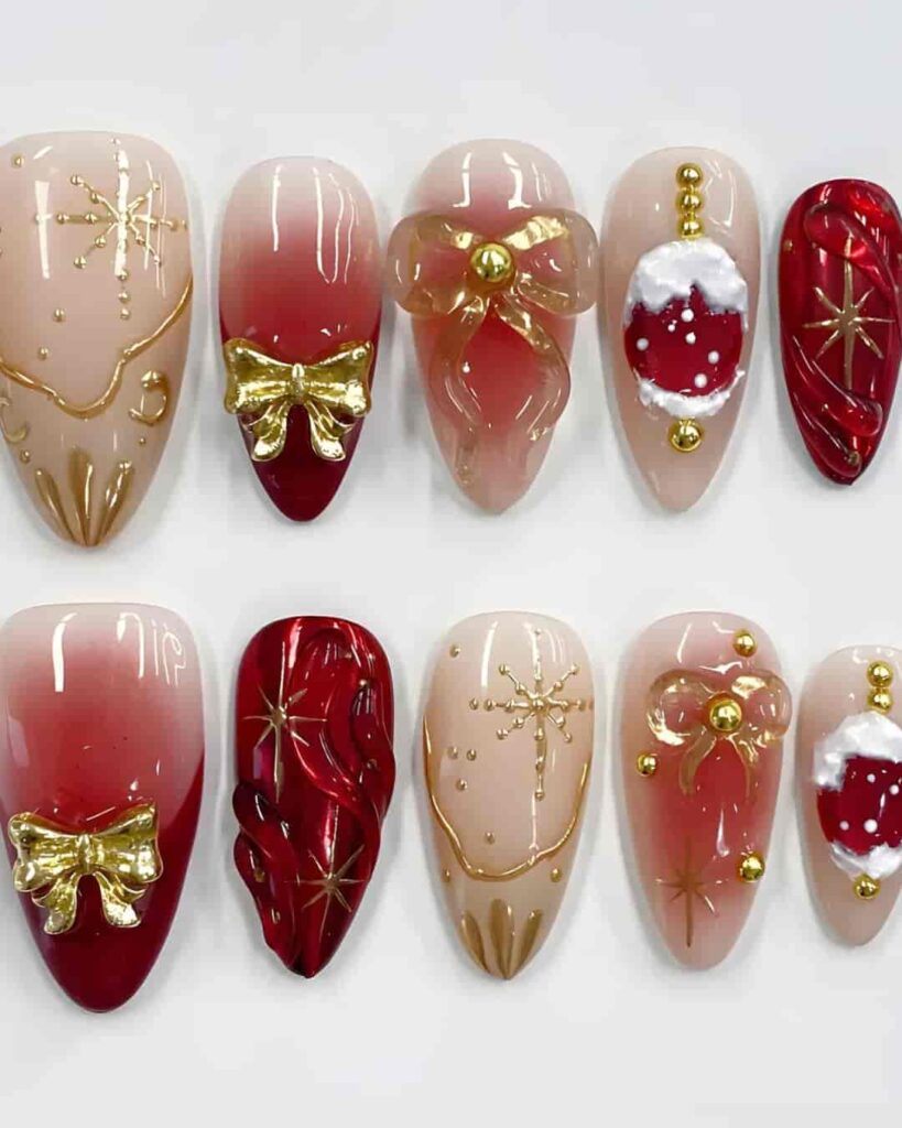 Warm and elegant, these golden christmas magic nails mix soft nude and red tones with tiny gold bows, ornaments and stars for a classy holiday style. The snowflakes and small details add charm without making the look too bold, which makes it perfect if you want simple christmas nails that still feel special and festive.