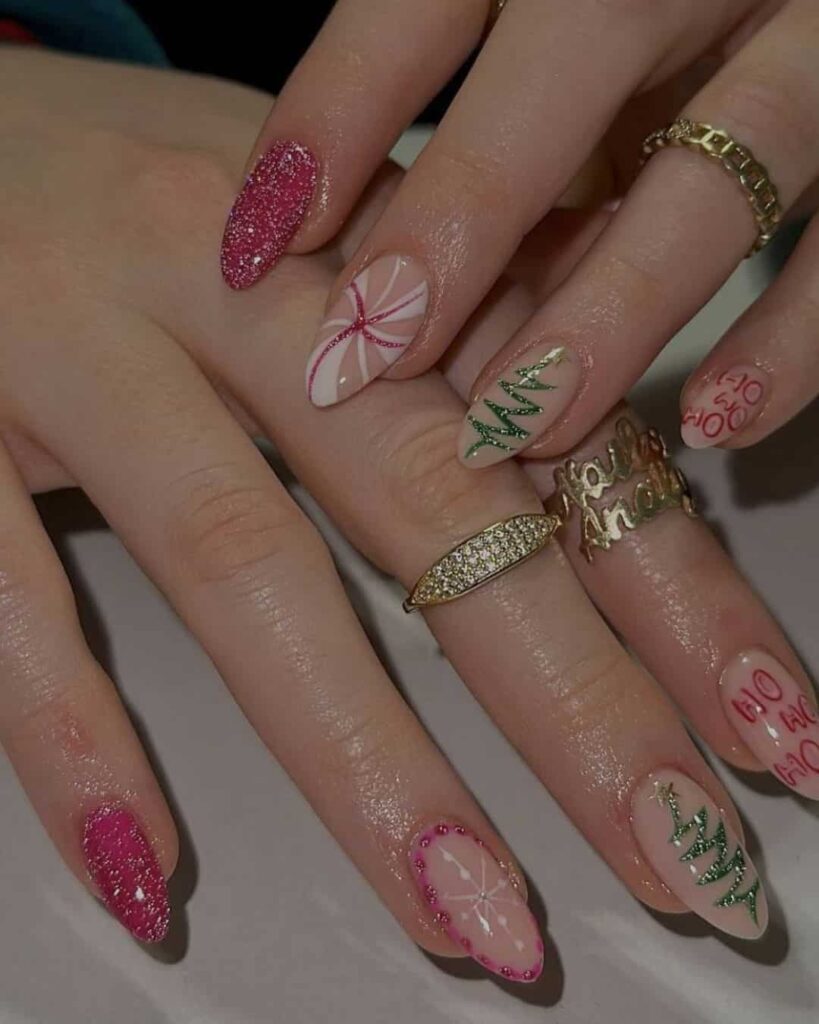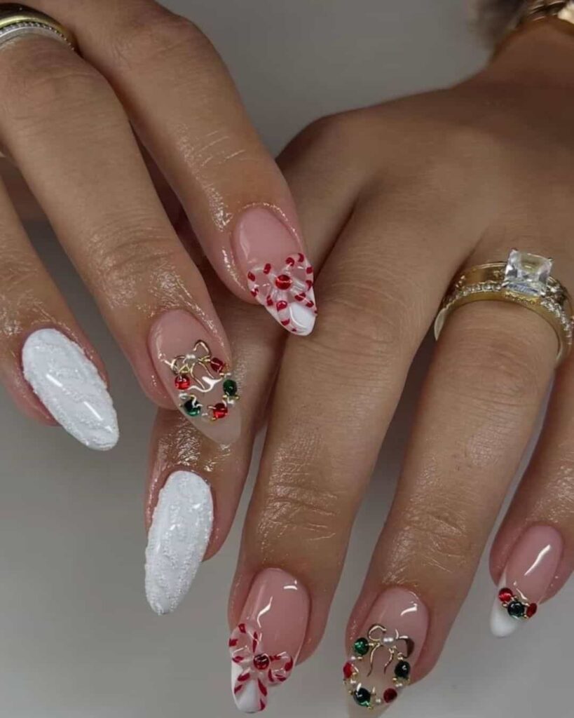 Festive and classy, these peppermint sparkle christmas nails mix red, white and green details with candy cane stripes, tiny wreath charms and glitter polish. Each nail has its own detail, so the look feels fun but still clean and stylish, which makes it great for christmas nail designs and simple christmas nails.