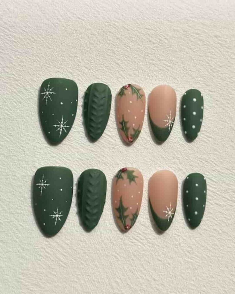 Cozy and soft, these holiday forest matte Christmas nails mix deep green tones with a nude base for a warm winter style. The matte finish gives them a comfy sweater-weather feel, and the tiny dots and snowflakes add a cute snowy touch, which makes them perfect if you like simple christmas nails or easy christmas nail designs that still look festive.