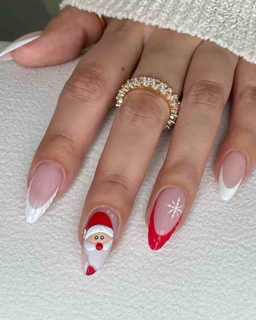 Charming and festive, these santa sleigh glam christmas nails mix red, white and soft nude for a stylish look that still feels playful. The Santa accent nail brings a fun holiday touch, while the snowflake and christmas french tip nails add a classic winter feel. This design works well if you love christmas nail ideas but still want something neat and clean.