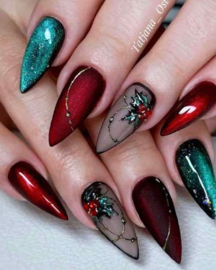 Bold and festive, these winter glam holly nails mix deep red and green shades with matte and glossy textures for a stylish finish. The tiny holly leaves add the perfect holiday detail, and the classic colors make the design work for parties or everyday wear. It’s a great pick if you love cute christmas nails that still look elegant.