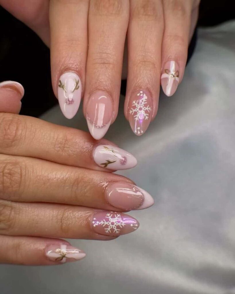 Soft and charming, the frosty pink elegance nails bring light pink tones, white snowflakes and a touch of sparkle for a dreamy winter look. The tiny reindeer and bow details make them feel festive without looking too bold, which is great if you want christmas nail designs that stay cute and wearable.