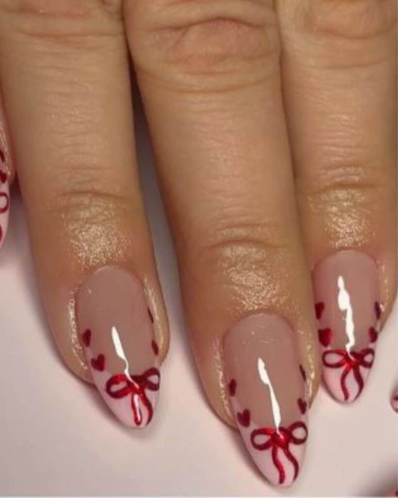 Sweet and festive, these red ribbon magic nails bring red bows, tiny hearts and a soft pink base for a cute holiday look. The glossy finish keeps the style clean and simple, which makes it perfect if you love cute christmas nails that still feel fun and wearable for everyday.