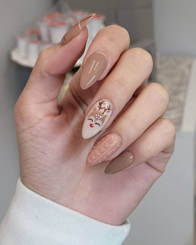 Soft and cute, these cozy reindeer charm christmas nails use warm nude tones with a tiny reindeer face for the perfect playful holiday touch. The design feels simple but festive, which makes it great if you love cute christmas nails or short christmas nails that still stand out in a subtle way.