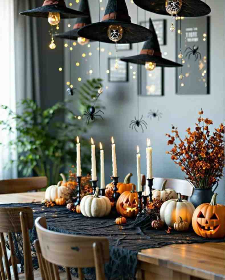 Surprisingly, The enchanted witch dinner halloween decor setup looks spooky and fun with pumpkins, candles, and hanging witch hats that glow like floating lanterns. The mix of orange, black, and warm lights makes it perfect for halloween party decorations, and it brings a cozy but magical feeling to the room. This setup can also be recreated using DIY halloween decorations or even dollar tree halloween decorations if you want a budget-friendly version.