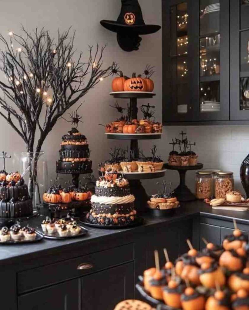 First, this sweet and spooky dessert bar halloween setup feels bold, playful, and perfect for a Halloween party table. The mix of pumpkin cakes, spooky trees, and black and orange treats makes the whole display pop. Since the styling looks simple but detailed, it works well for halloween decorations, halloween decor, and halloween party decorations for any celebration.