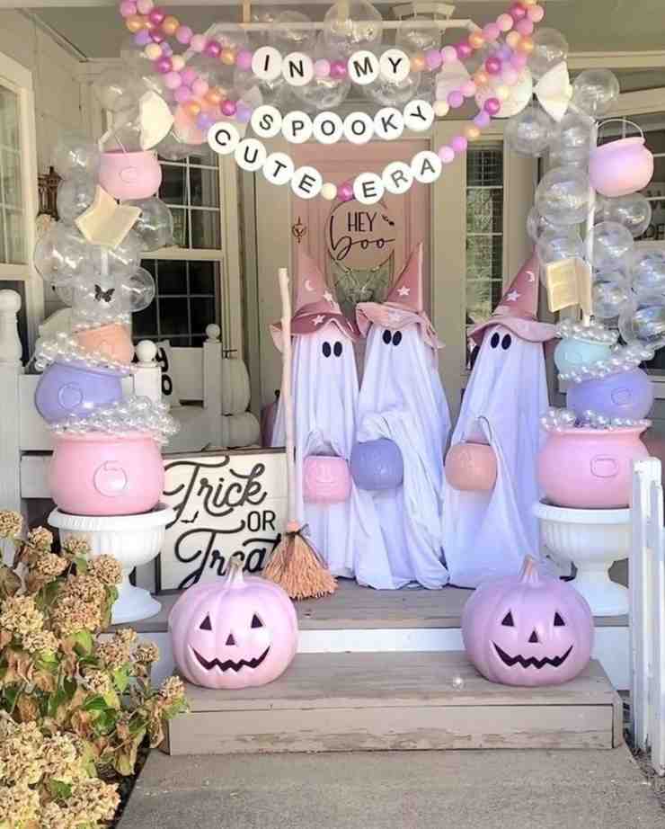 The spooky cute porch halloween decor setup creates a soft and friendly look with pastel pumpkins, bubble balloons, and sweet ghost figures wearing tiny witch hats. It’s perfect for outdoor halloween decor because it feels playful and inviting rather than scary. Also, this setup can be made using DIY halloween decorations or affordable finds like dollar tree halloween decorations, which makes it a great option if you want cheap halloween decor that still feels creative and different.