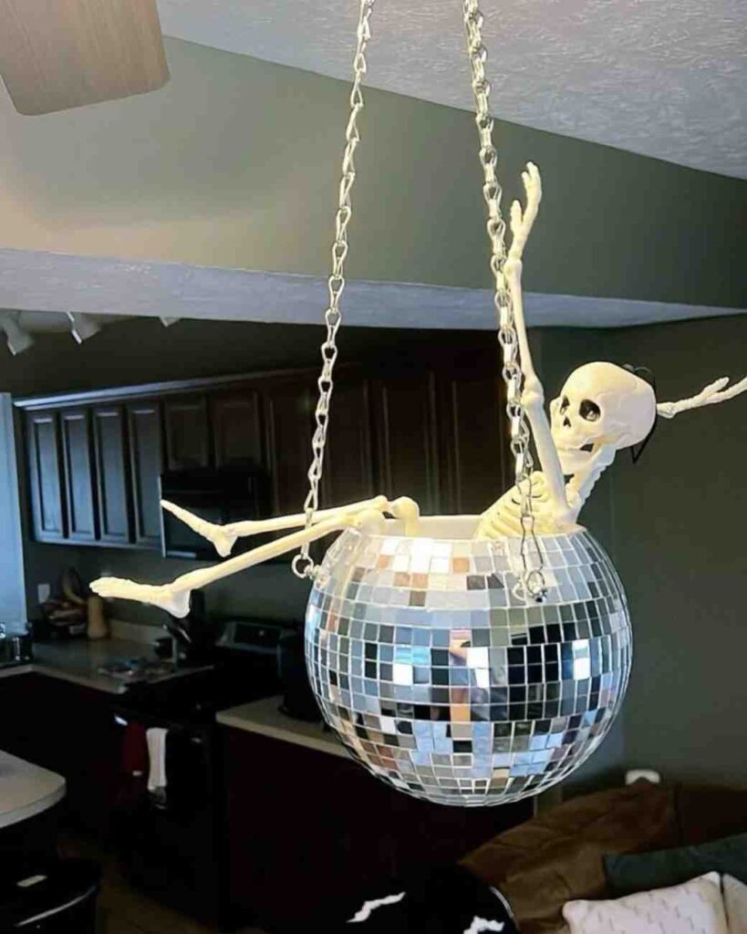 Firstly, the skeleton disco vibe halloween decor setup is cute, funny, and memorable, showing how even small DIY halloween decorations can make a big impact. The hanging skeleton on the disco ball adds a playful spooky twist to halloween decorations, and because it’s so easy to make, it works well for cheap halloween decor, dollar tree halloween decorations, and halloween party decorations.