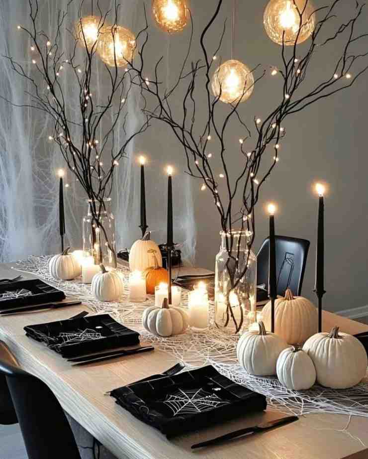 Surprisingly, the ghostly dinner party halloween decor setup feels spooky but still playful, and it makes the table look like something pulled right from a Halloween party idea board. The glowing ghosts, tall candlesticks, and soft lighting create a cozy but slightly chilling atmosphere, while the little black bats add just the right detail. Because everything is arranged so neatly, it also stands out as one of the best Halloween decorations to try if you want something simple yet attention-grabbing.