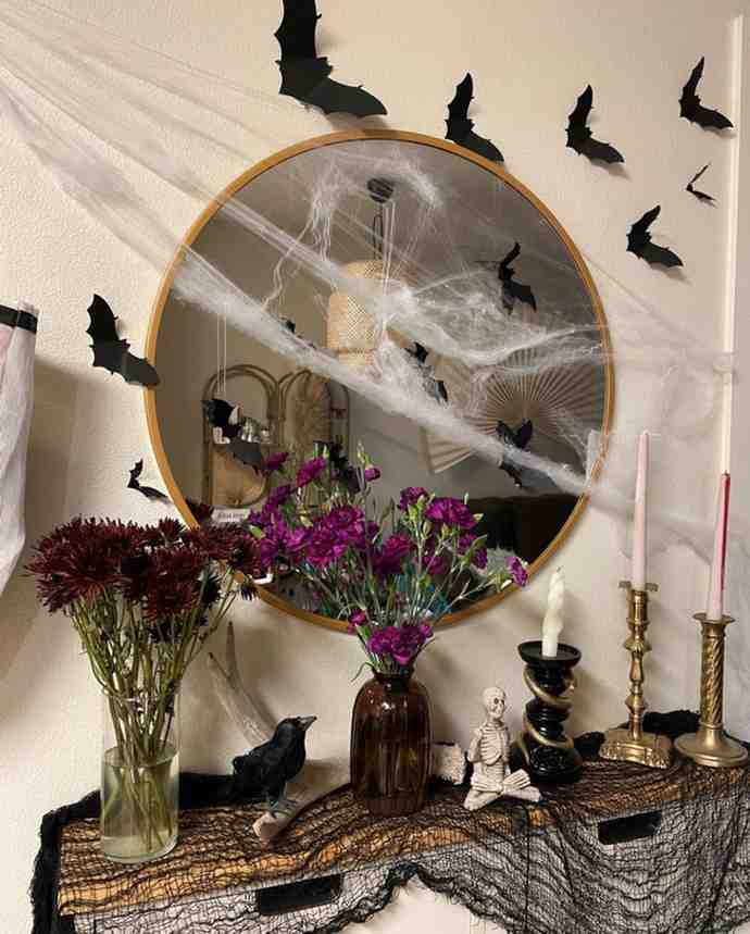 To begin, the spooky mirror magic halloween decor setup feels mysterious and fun, making it great for anyone who loves DIY halloween decorations with a creative twist. The bats, spider webs, dark flowers, and tiny skeleton with a crow create a haunted look that still feels stylish, showing how simple halloween decoration ideas can make a big impact.