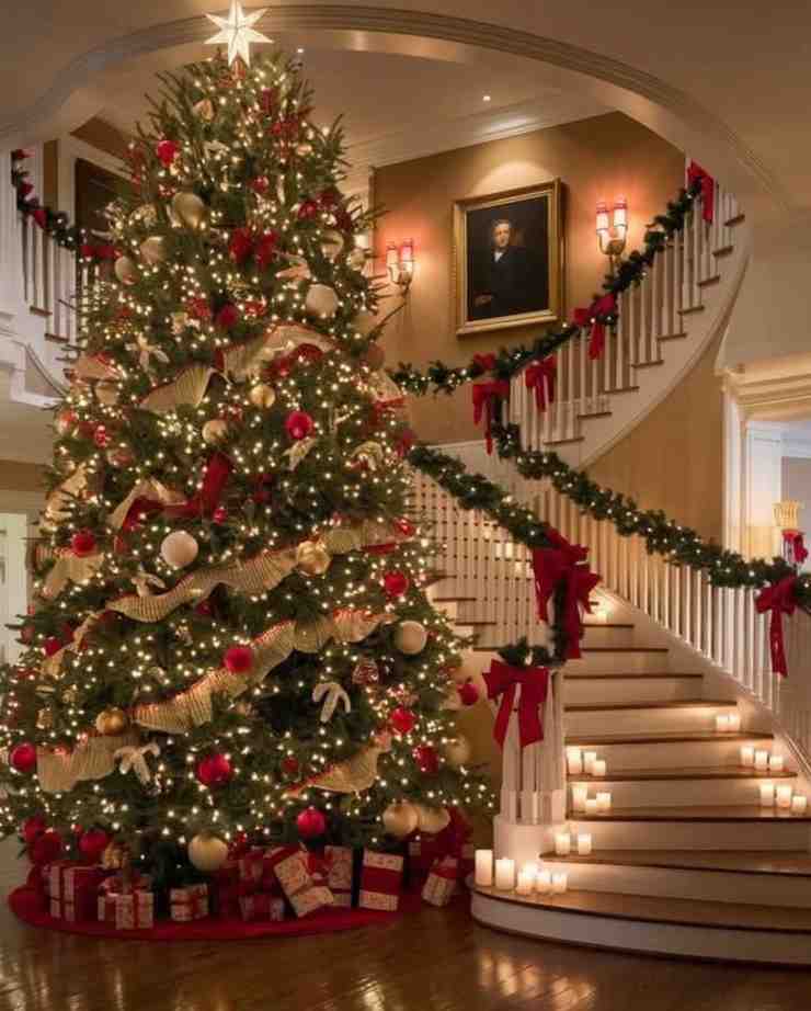 Warm and festive, the classic christmas staircase magic setup creates a cozy holiday scene with glowing lights, wrapped gifts, red bows, golden ornaments, and a beautiful Christmas tree. The garland with ribbons across the staircase and soft candles adds elegance, making it a perfect idea for christmas decorations indoor and christmas tree decorating ideas if you want a traditional holiday look.