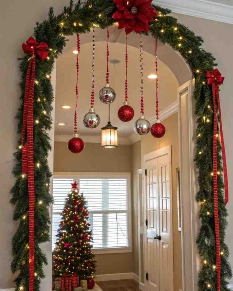 Bright and cheerful, this holiday welcome archway christmas decor setup creates a warm first impression with glowing lights, classic green garland, and shiny ornaments. The red bows add a festive touch, and the hanging baubles make the entrance feel fun and inviting, making it a great choice for christmas decorations indoor.