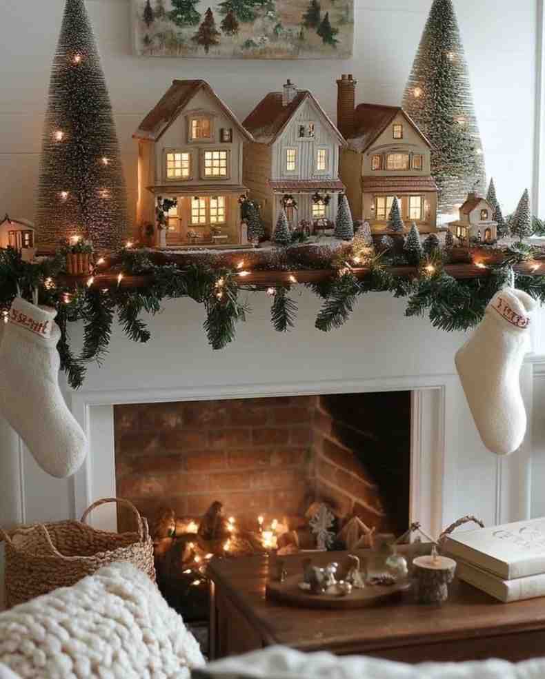Warm and magical, this cozy christmas fireplace village setup brings a charming holiday feel to any room. The glowing mini houses and snowy trees create a peaceful winter scene, and the stockings and garland make the fireplace look classic and festive. Because the soft lights tie everything together, it becomes a perfect idea for christmas decorations with a timeless touch.
