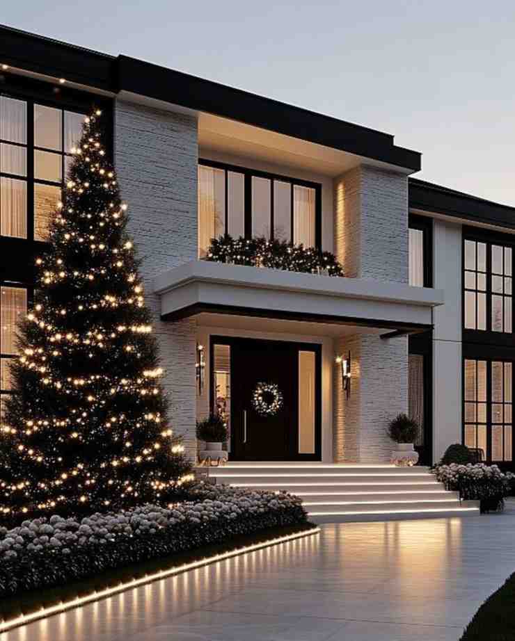 Soft and welcoming, this sparkling holiday entrance setup creates a magical first impression with glowing pathway lights, a bright Christmas tree and a classic wreath on the door. The simple arrangement makes everything feel clean, modern and cozy, showing how christmas decorations can look beautiful without being overwhelming.