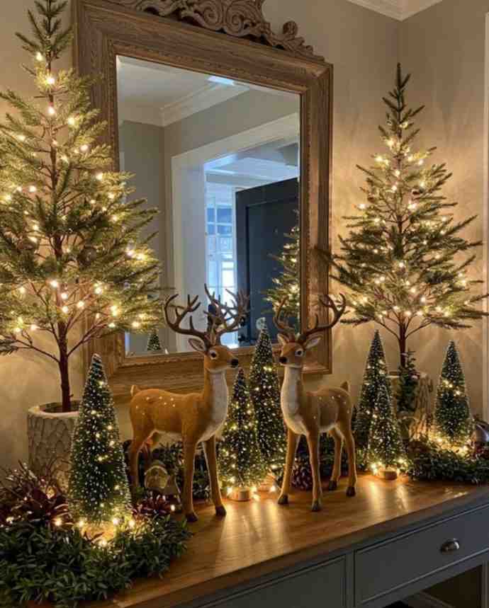 Warm and full of charm, this woodland christmas entry setup creates a welcoming holiday feel with glowing trees, soft fairy lights and two adorable reindeer in the center. The mix of greenery and bottlebrush trees gives a cozy winter forest look, and it works beautifully for christmas decorations indoor or small hallway displays. With the mirror reflecting the lights, the space feels brighter and more magical.