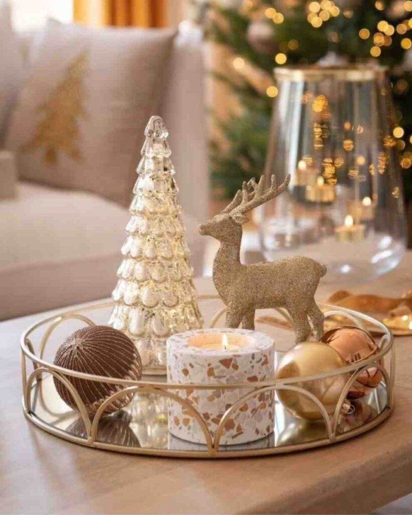 Elegant and warm, this golden christmas glow setup brings a cozy holiday feel with golden reindeer, shiny ornaments and a sparkling glass tree. The soft candlelight in the center makes everything glow, turning it into a perfect idea for christmas table decorations or christmas decorations indoor. It adds a classy touch while still feeling festive and inviting.