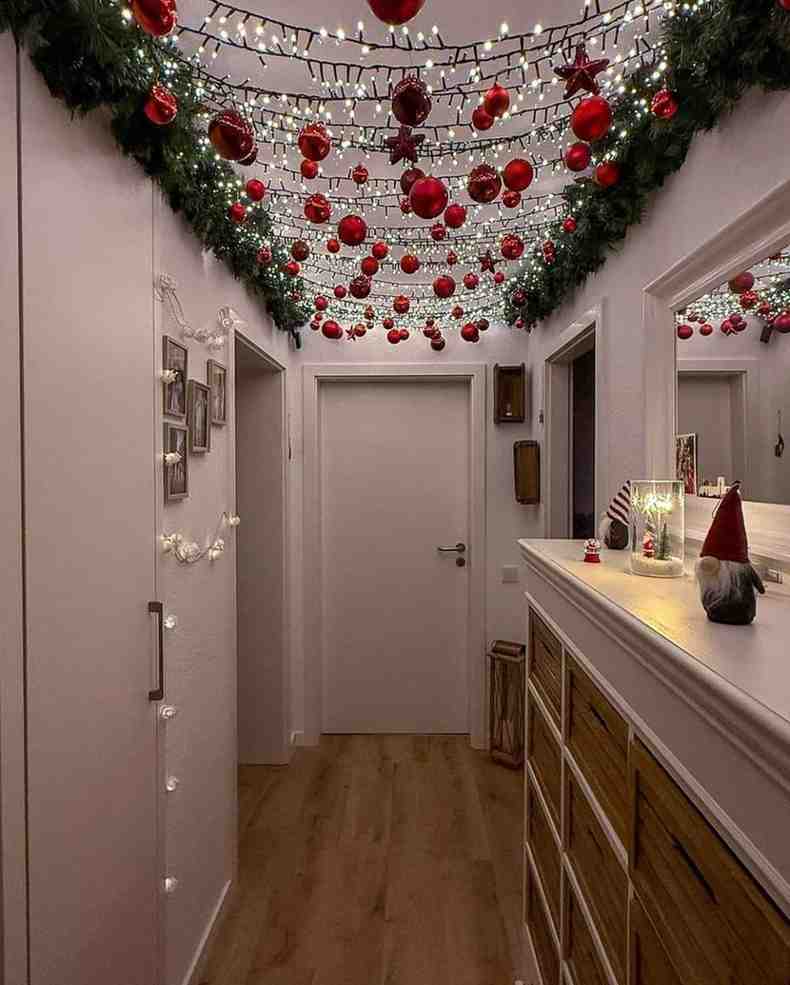 Warm and festive, The magical christmas hallway decor creates a cheerful welcome with fairy lights, hanging ornaments and rich greenery. The glowing red baubles and soft lighting make the space feel cozy, and the garland adds a classic holiday touch. Because everything works together, the hallway becomes an eye-catching part of your christmas decorations and overall christmas decor theme.