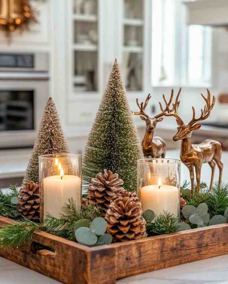 Warm and inviting, this winter forested pine tray christmas decor setup creates a cozy holiday feel with soft candles, snowy pinecones and mini frosted trees. The wooden tray and golden reindeer make the display look natural yet elegant, showing how simple christmas decorations can still look festive and charming. It works well for christmas decorations indoor and is a great option for shelves, countertops or christmas table decorations.
