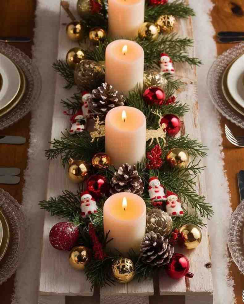 Warm and cozy, this candlelight christmas table charm setup creates a festive mood with glowing candles, pinecones, tiny Santa figures and classic red and gold ornaments. The small details make the whole setup feel joyful and elegant, and it works beautifully for christmas decorations indoor or even diy christmas decorations for a dining space or coffee table.