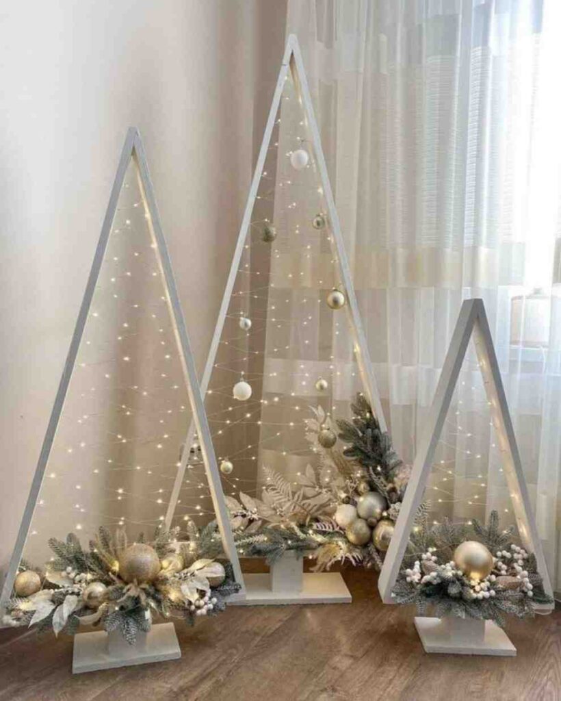Soft and magical, these modern golden glow christmas triangle trees create a warm holiday feel with fairy lights and gold ornaments. The setup looks calm, modern and elegant, which makes it perfect if you love simple christmas decorations that still feel festive and beautiful without being too busy.