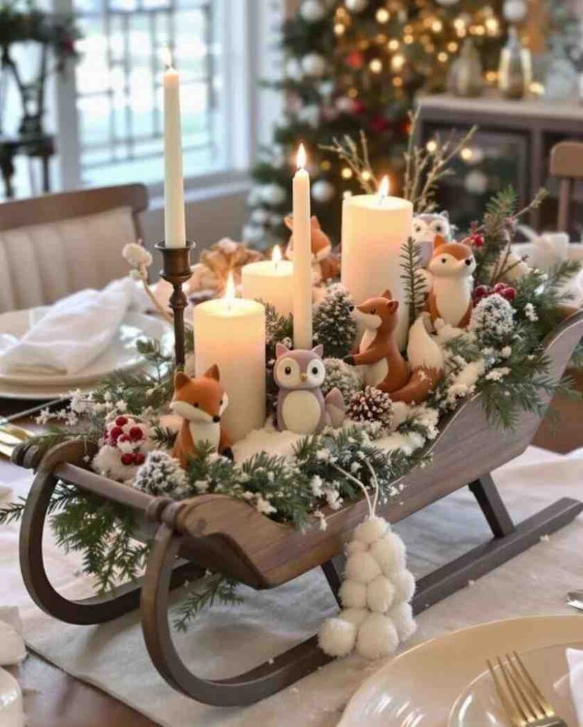 Full of charm, this winter woodland sleigh magic setup creates a cozy holiday scene with candles, snowy greens and adorable woodland animals sitting in a wooden sleigh. The foxes, owl and frosted branches make the design playful and warm, and it works beautifully as christmas decorations indoor or as a creative piece for christmas table decorations. The natural textures give it a soft winter feel that suits both small and large spaces.