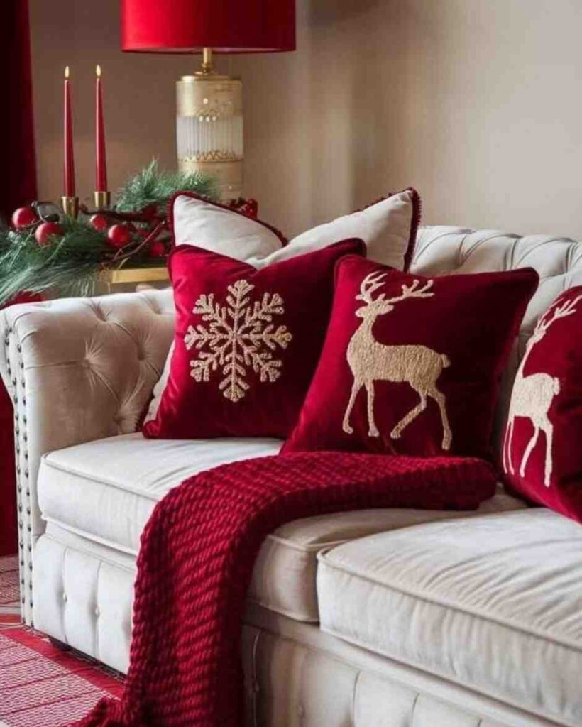 Inviting and festive, this cozy christmas living room glow setup adds warmth with deep red cushions, soft textures, and simple christmas decorations. The reindeer and snowflake pillows bring a classic touch, while the cozy throw makes the sofa perfect for relaxing. Paired with red candles and greenery on the side table, the space feels balanced and harmonious, offering beautiful inspiration for christmas decorations indoor.