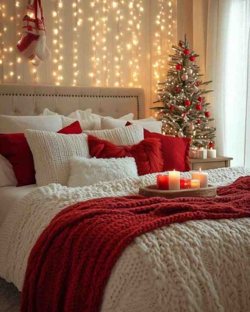 Peaceful and festive, the cozy christmas bedroom glow setup brings warmth with soft fairy lights, a small decorated tree, and a mix of red and white pillows. Chunky knit blankets, candles, and stockings add charm, making the room feel magical and relaxing. This setup is a perfect example of cozy christmas decor ideas and christmas wall decor, showing how thoughtful touches can elevate any space.