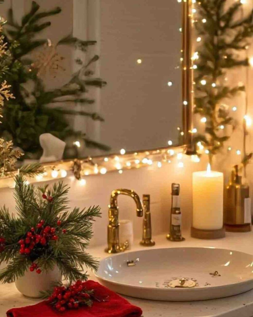 Warm and inviting, this cozy golden christmas glow setup brings a festive touch to the bathroom with soft fairy lights around the mirror, gold accents, and natural greenery with red berries. The combination creates a cheerful yet calm atmosphere, making it a simple and stylish example of easy christmas decoration ideas.