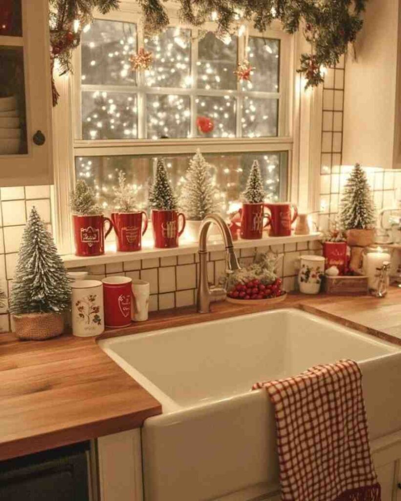 Festive and inviting, this cozy christmas kitchen window setup brings warmth with small snowy trees, red mugs, and golden lights. The glowing decorations create a joyful, cozy atmosphere, and the soft light on the window adds a peaceful, magical touch that feels like a snowy holiday evening. This simple yet charming arrangement shows how christmas decorations can transform any space.