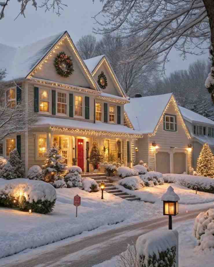 Magical and inviting, this winter wonderland house features warm lights, snowy trees, and a festive red door. The glowing wreath and twinkling string lights create a cozy, joyful atmosphere, while the outdoor christmas decorations add classic charm. With soft snow surrounding the scene, the setup feels peaceful and perfect for the holiday season, offering wonderful christmas decoration ideas for a warm, welcoming home.