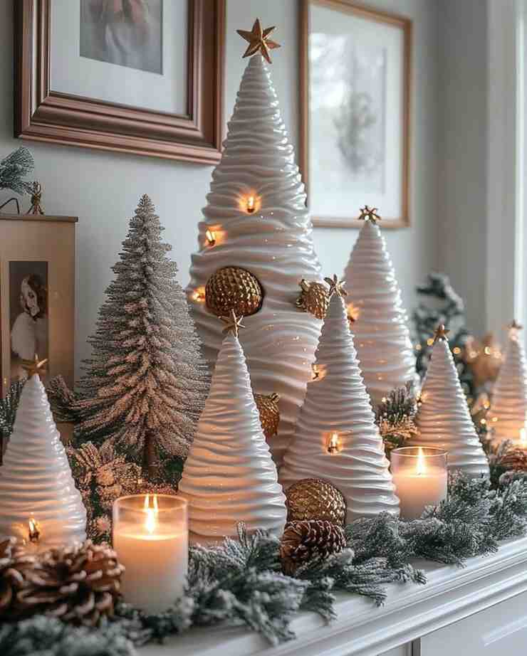 Elegant and cozy, this winter wonderland mantel magic setup features white ceramic trees, soft candles, frosted greenery, and gold ornaments. The warm lights create a calm, welcoming atmosphere, making it a perfect example of modern christmas decorations and christmas wall decor that feels peaceful and stylish.