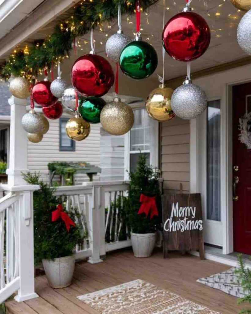 Bright and inviting, this giant ornament christmas porch setup creates a cheerful first impression. The colorful ornaments, greenery and fairy lights make the entry feel fun and festive, and this style works well for classic christmas decorations, diy christmas decorations or christmas outdoor decorations when you want your home to stand out.