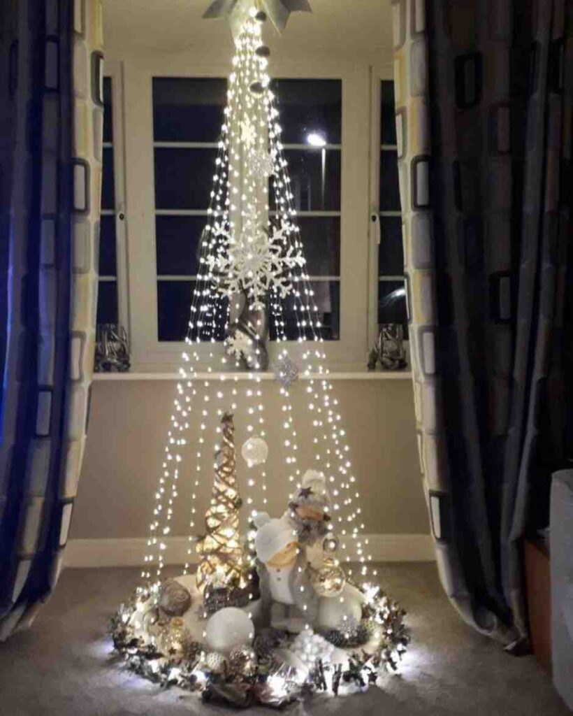 Soft and dreamy, this christmas sparkling winter fairy tree decor feels magical with glowing fairy lights forming a simple tree shape. The snowflakes, ornaments and cozy figurines add charm, and because the look is calm and modern, it works well for christmas decor, christmas decorations and peaceful holiday styling.