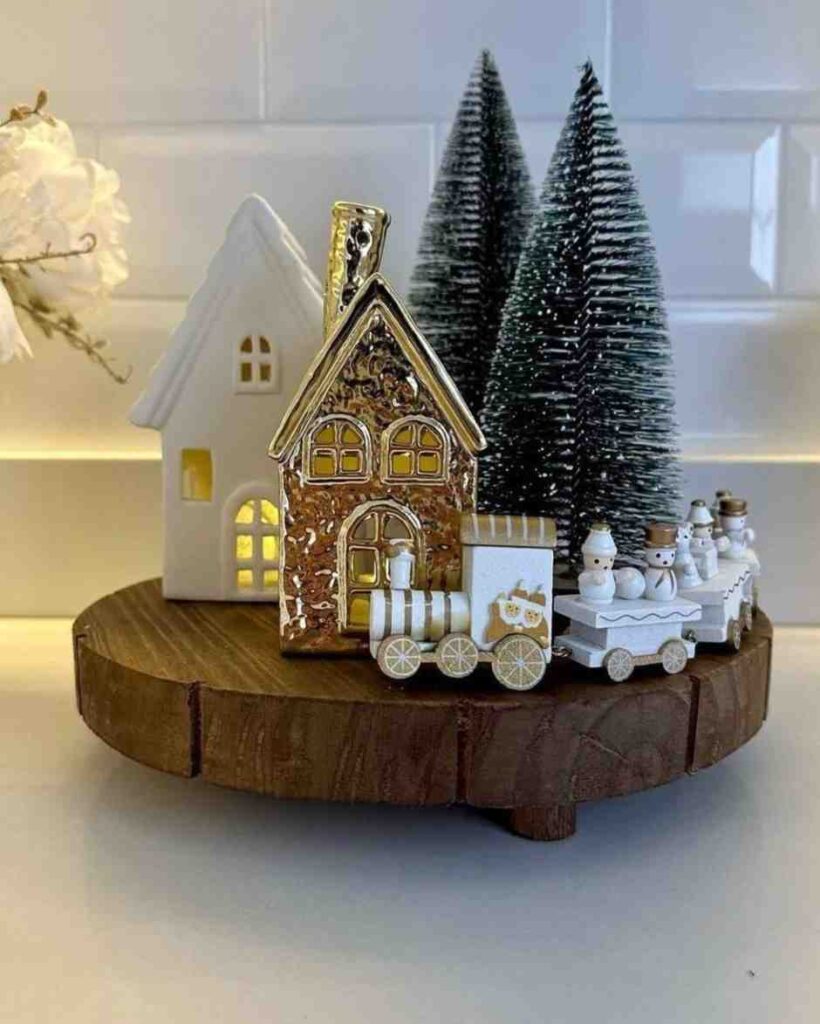 Warm and magical, this winter village charm christmas decor setup brings a cozy village feel to any space. The snowy trees, golden house and tiny Christmas train add joy and because the style is simple and calm, it pairs easily with many christmas decor and christmas decorations for the season.