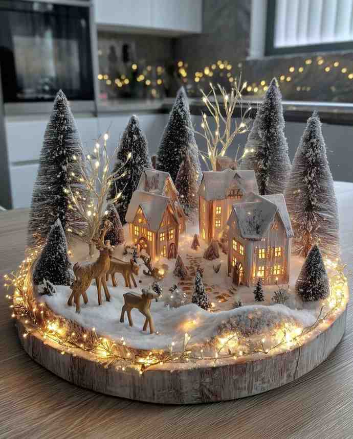 Magical and cozy, this winter wonderland village tray christmas decor idea features snowy trees, tiny houses and glowing lights that bring a warm holiday feel to any room. It works nicely with christmas decorations indoor and can also be used as a christmas table decorations piece. The deer figures and soft lights make it look like a quiet holiday village, giving inspiration for diy christmas decorations and christmas decoration ideas.