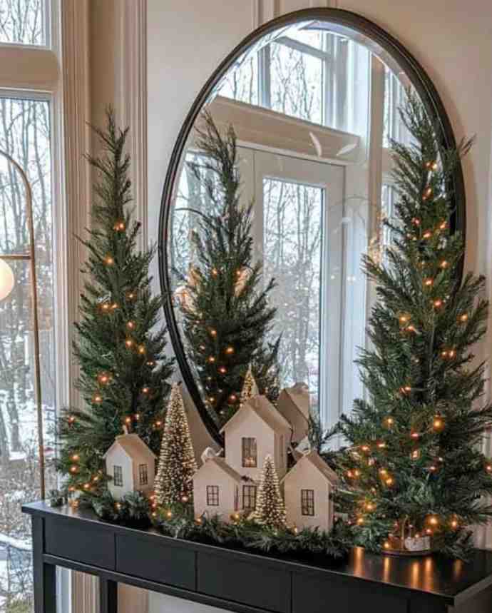 Soft and charming, this winter cottage glow setup brings a warm holiday feeling to the home with small houses, mini trees, and gentle lights that create a magical village scene. The mirror helps reflect the lights, making the display appear brighter and fuller, which makes it a lovely option for christmas decorations indoor and simple festive styling.